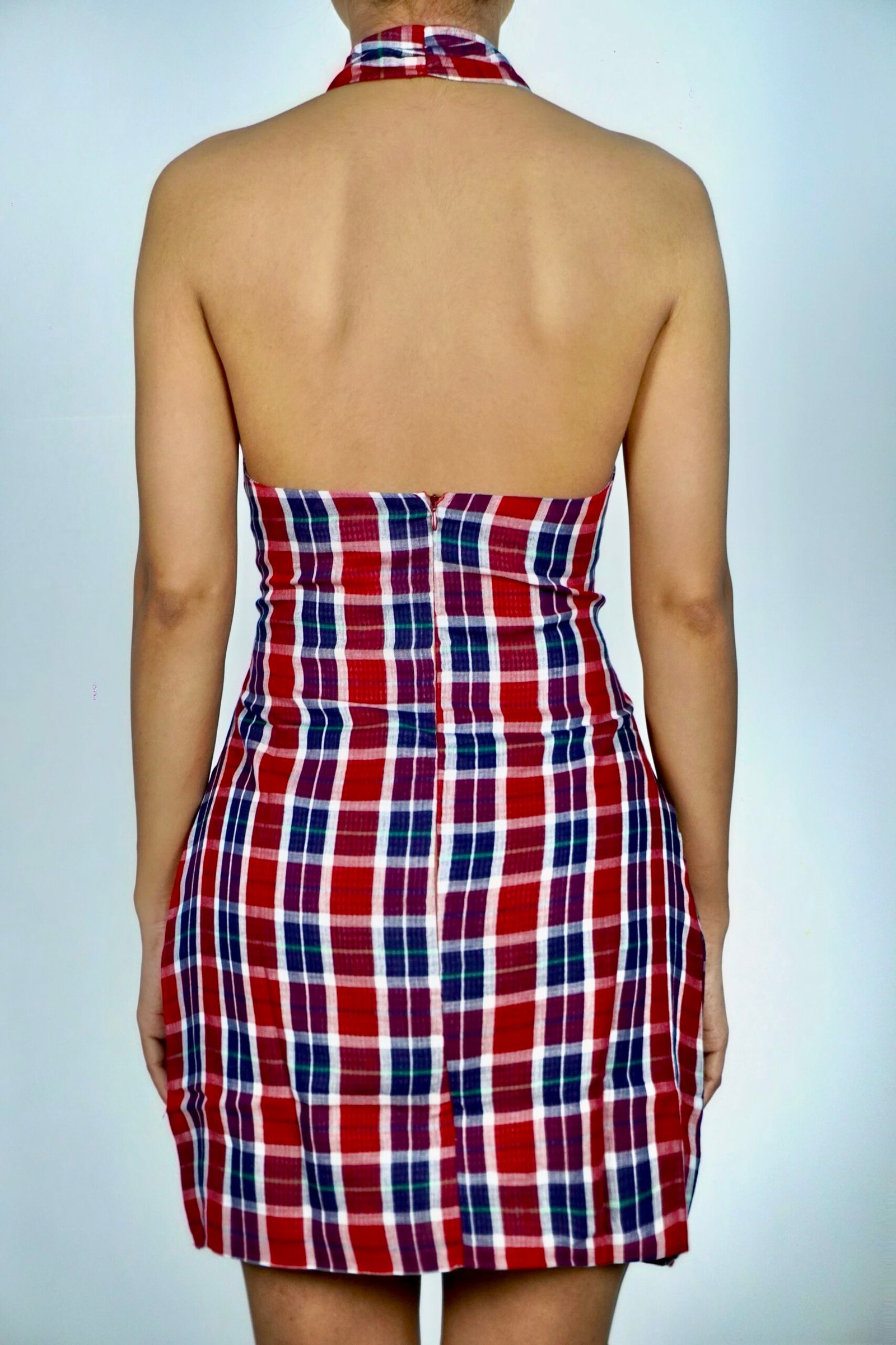 Elevate your wardrobe with this eye-catching halter-style mini dress. Designed with a flattering deep V-neckline, this dress embodies sophistication and charm, making it a must-have for fashion enthusiasts who value both style and comfort. The vibrant red, blue, and white plaid pattern takes center stage, offering a playful twist on a vintage-inspired look that is perfect for any occasion.